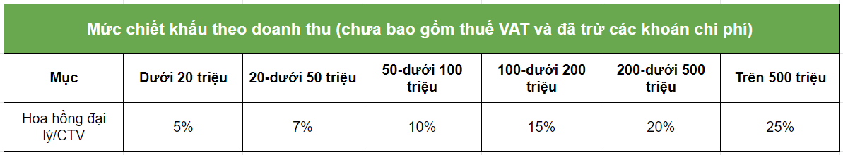 - Đại lý kinh doanh/CTV kinh doanh được hưởng 5% hoa hồng trên doanh thu(chưa bao gồm thuế VAT và đã trừ các khoản chi phí) của Đại lý Kinh doanh/CTV kinh doanh trực tiếp tuyển dụng và quản lý.